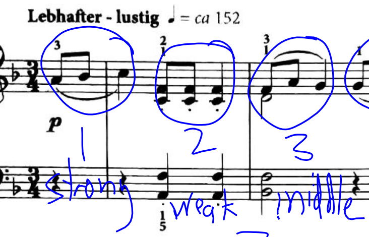- bar 1, three characters, strong weak medium. Don’t get too loud on strong