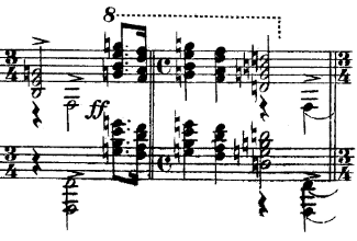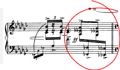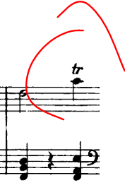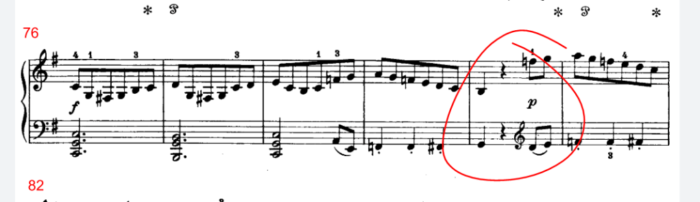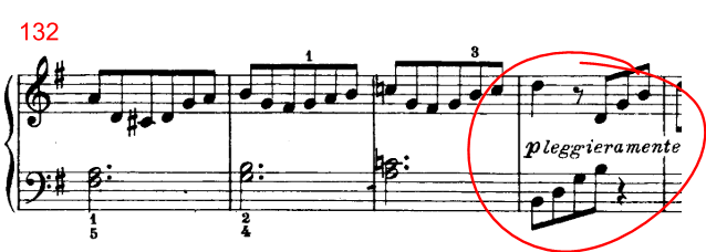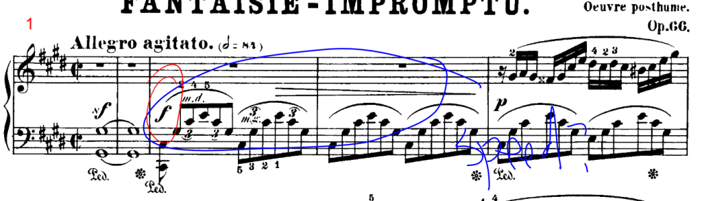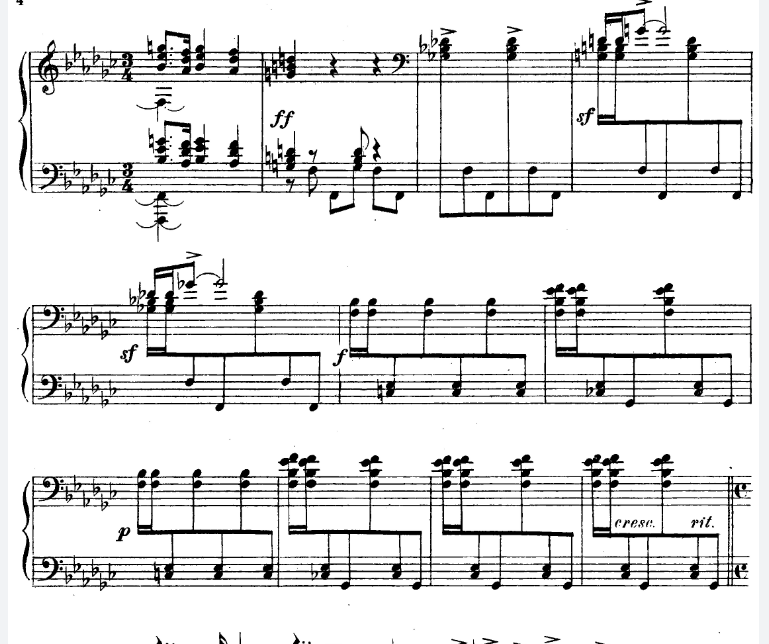 - In f sections, still balance heavily towards RH melody. (bar 1)
